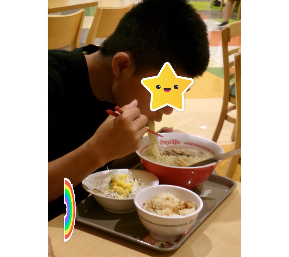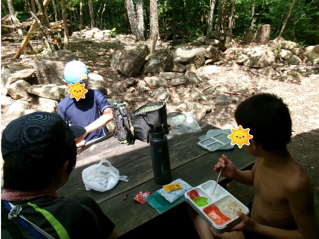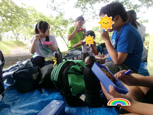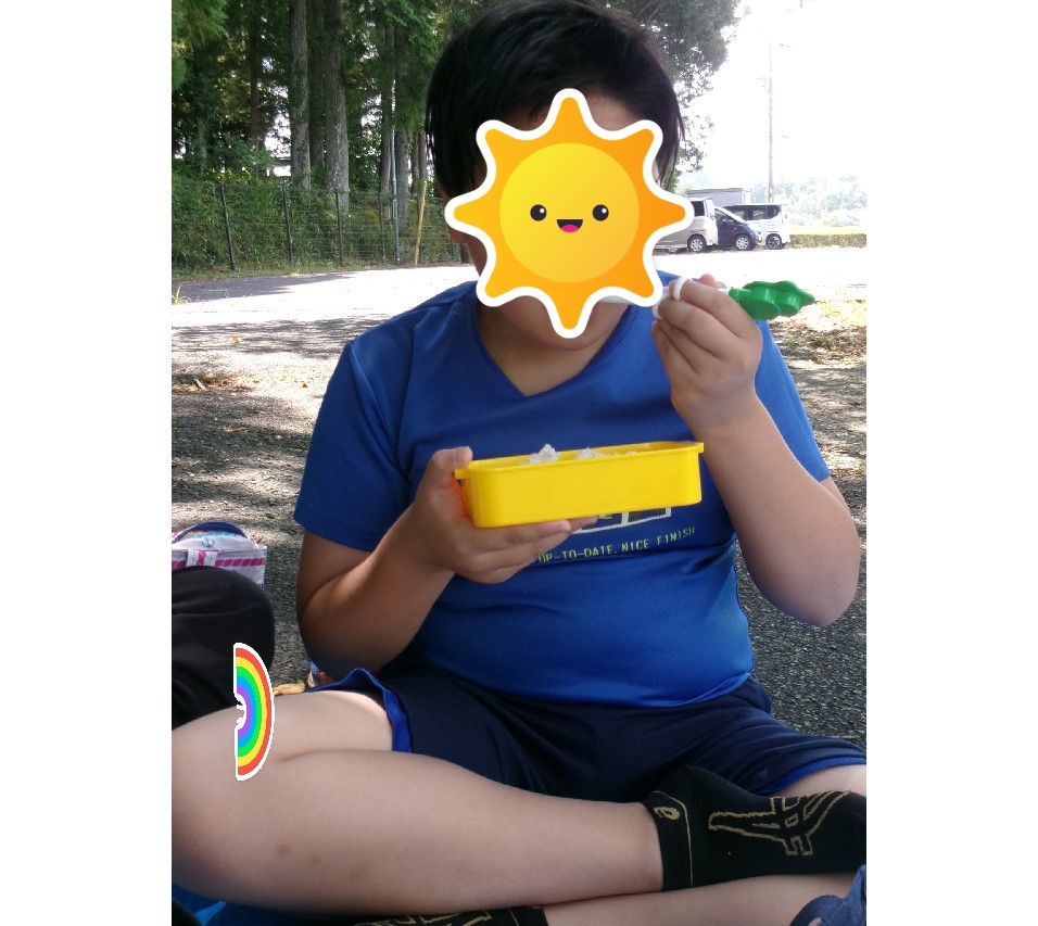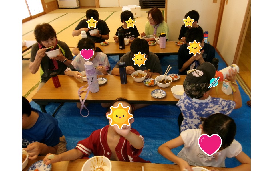 長期休みには、お弁当持参で通所していただきます。(夏場のお弁当は気を使われましたよね。ありがとうございました。) 子ども達はほとんど残すことなく完食。 カレーを自分たちで作ったり、魚釣りに行って川で釣った魚を焼いてもらったり、小遣いで外食体験をしたり・・、友達みんなといっぱいたくさんの体験をすることができました。 食べてる時は、みんな幸せいっぱいの顔をしています。顔が見えなくてごめんなさい。m(_ _)m